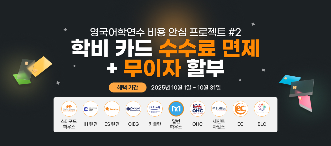 Kaplan London 카플란 런던 12주 기준 정상학비 3,900파운드 / 748만원 장학혜택 학비14.5%할인 학교내기숙사 St Giles London Central 세인트 자일스 런던 센트럴 12주 기준 정상학비 3,960파운드 / 759만원 장학혜택 최대20%할인 EC English London 이씨 잉글리쉬 런던 12주 기준 정상학비 4,140파운드 / 794만원 장학혜택 학비15%할인