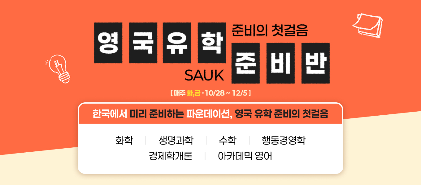 영국대학교 합격자 현황 실시간으로 업데이트되는 영국대학교 합격자 리스트 ★영국어학연수 풀서포트 프로모션★ 영국전문가가 출국 준비부터 귀국까지!쉿! 비밀 혜택 적용 학비 문의 필수 영국약대 준비 프로젝트 영국약대 지원부터 입학까지 함께하는 약대 프로젝트모든 서포트 무료 제공(원어민수업/인터뷰지원) 영국어학연수 학교 검색 가격별 | 지역별 | 코스별 | 숙소별 | 특징별영국 어학원 검색하기 [SAUK 학업서포트] 10월 IELTS 라이팅 집중반 현 IELTS 스피킹 시험관 필립선생님과 함께하는IELTS 라이팅 온라인 클래스! 영국어학연수 멀티 서포트 영국어학연수 끝날때까지 계속되는 서포트한국지사/런던지사의 학생서포트 후기