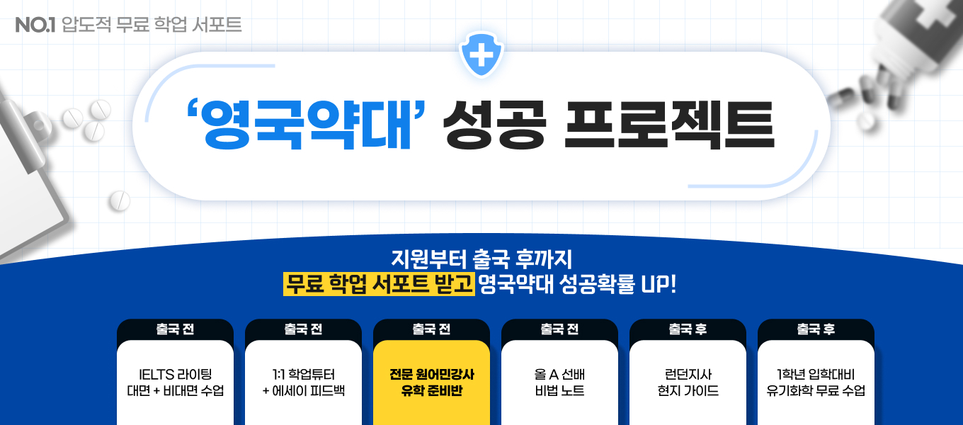 영국대학교 합격자 현황 실시간으로 업데이트되는 영국대학교 합격자 리스트 ★영국어학연수 풀서포트 프로모션★ 영국전문가가 출국 준비부터 귀국까지!쉿! 비밀 혜택 적용 학비 문의 필수 영국약대 준비 프로젝트 영국약대 지원부터 입학까지 함께하는 약대 프로젝트모든 서포트 무료 제공(원어민수업/인터뷰지원) 영국어학연수 학교 검색 가격별 | 지역별 | 코스별 | 숙소별 | 특징별영국 어학원 검색하기 영국유학준비반 #The Original #무료수업 파운데이션 수업을 한국에서 100% 영어로 선행을 하다!원어민 전문강사 직강, 대면수업, 검증된 커리큘럼, SAUK 수속자 한정 ‘무료수업’ 영국어학연수 멀티 서포트 영국어학연수 끝날때까지 계속되는 서포트한국지사/런던지사 2중 현지학생 서포트 후기 모음