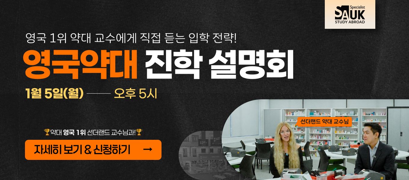 영국대학교 합격자 현황 실시간으로 업데이트되는 영국대학교 합격자 리스트 ★영국어학연수 풀서포트 프로모션★ 영국전문가가 출국 준비부터 귀국까지!쉿! 비밀 혜택 적용 학비 문의 필수 영국약대 준비 프로젝트 영국약대 지원부터 입학까지 함께하는 약대 프로젝트모든 서포트 무료 제공(원어민수업/인터뷰지원) 영국어학연수 학교 검색 가격별 | 지역별 | 코스별 | 숙소별 | 특징별영국 어학원 검색하기 영국유학준비반 #The Original #무료수업 파운데이션 수업을 한국에서 100% 영어로 선행을 하다!원어민 전문강사 직강, 대면수업, 검증된 커리큘럼, SAUK 수속자 한정 ‘무료수업’ 영국어학연수 멀티 서포트 영국어학연수 끝날때까지 계속되는 서포트한국지사/런던지사 2중 현지학생 서포트 후기 모음