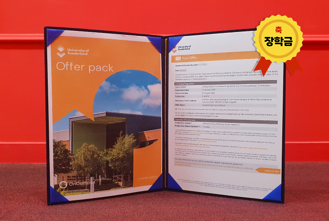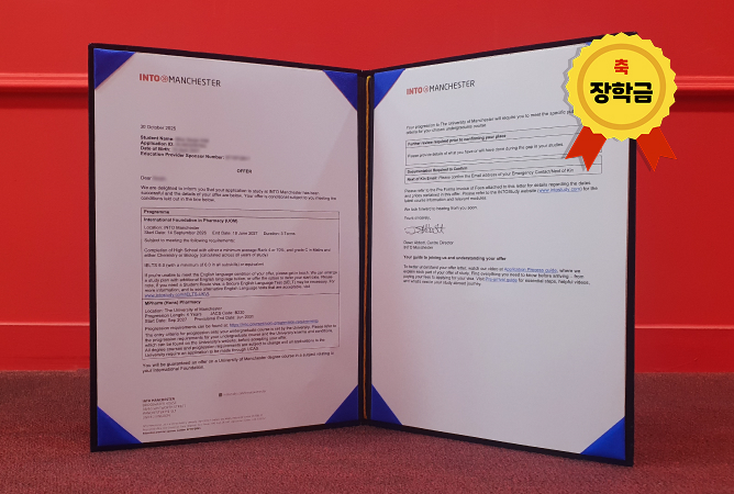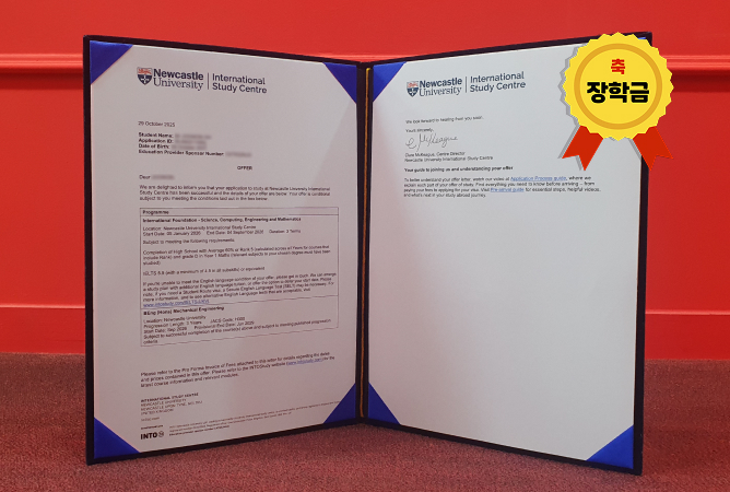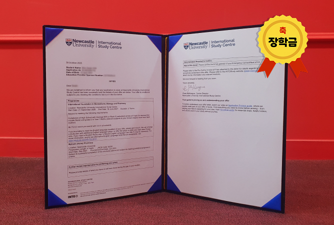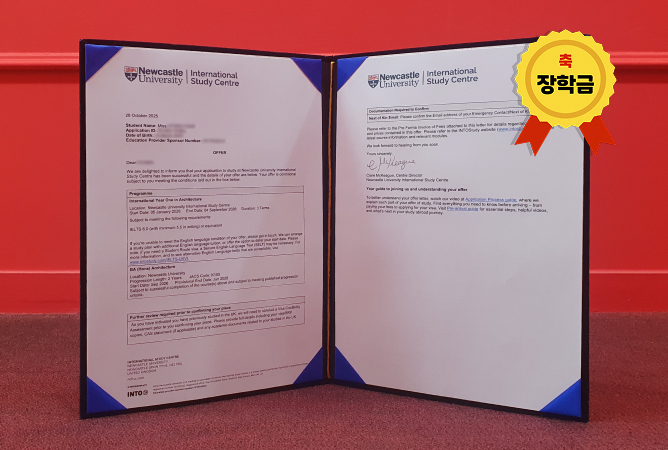 University of Sunderland [26년 1월 시작] 황** - 선더랜드대학교 약대 파운데이션 합격 검정고시 성적으로 지원, 선더랜드 약대 파운데이션 합격장학금 적용 학비 13,000파운드 획득 [26년 9월 시작] 유** - 카디프 메트로폴리탄 대학교 MA Ceramics and Maker 합격 국내대학교 관련 전공 졸업 후, 카디프 메트로폴리탄 대학원 MA Ceramics and Maker 합격장학금 3,500파운드 획득, 학비 조기 완납 시 1000파운드 추가 제공 Newcastle University [26년 1월 시작] 최** - 뉴캐슬대학교 기계공학 파운데이션 합격 현재 국내고등학교 이과 3학년 재학 중으로, 뉴캐슬대학교 기계공학 파운데이션 합격파운데이션 부터 졸업까지 매년 학비 17,000파운드 고정 The University of Manchester [26년 9월 시작] 박** - 맨체스터대학교 약대 파운데이션 합격 현재 국내 고등학교 이과 3학년 재학 중으로, 맨체스터대학교 약대 파운데이션 합격파운데이션 장학금 최대 5,000파운드 예상 Newcastle University [26년 9월 시작] 박** - 뉴캐슬대학교 약대 파운데이션 합격 현재 국내 고등학교 이공계 3학년 재학 중으로, 뉴캐슬 약대 파운데이션 합격파운데이션부터 졸업까지 매년 학비 17,000파운드 고정 신청 예정 Newcastle University [26년 1월 시작] 이** - 뉴캐슬대학교 인터네셔널 이어원 건축학과 합격 영국 러셀그룹 건축 파운데이션 마친 후 지원, 뉴캐슬대학교 인터네셔널 이어원 건축학과 합격인터네셔널 이어원부터 졸업까지 매년 학비 17,000파운드 고정