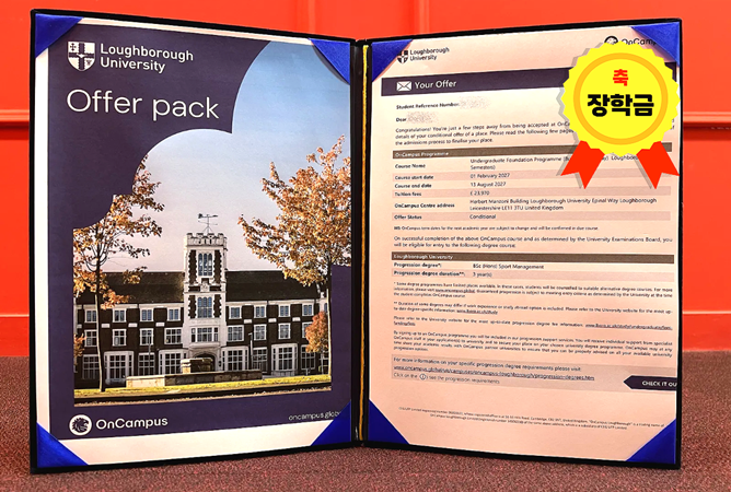 Loughborough University [2027년2월 시작]박** - 러프버러대학교 스포츠경영 파운데이션 합격 올해 고3 재학중으로 고2 원점수 80%이상 성적으로 지원, 졸업하고 27년 2월 입학 예정!최대 장학금 5,000 파운드 제공 예정 Goldsmiths, University of London [2026년 9월 시작] 최** - 골드스미스 대학교 MA Luxury Brand Management 합격#Master 뷰티 메이크업학과 + 학점 4.15 + 뷰티업계 마케팅 경력 2년무료 서포트: 자기소개서, 추천서 가이드 제공 + 학업 튜터 1:1 수업 제공 + 원어민의 석사 논문 피드백 제공 The Hague University of Applied Sciences [2027년1월 시작] 안** - 헤이그대학교 국제 커뮤니케이션 매니지먼트 파운데이션 합격 국내특성화고 졸업 후 직장생활 중 지원 후 합격파운데이션 장학금 500유로 제공 중 단, 5월 30일까지 보증금 납부 완료 시 장학금 획득 가능 University of Birmingham [2026년9월 시작] 이** - 버밍엄대학교 약대 합격 #UCAS 국내고등학교 문과 내신 60%이상으로 졸업+영국 현지 러셀그룹 대학교 부설 약대 파운데이션 재학 중 UCAS 지원무료 서포트: 유카스 지원서 작성 + 자기소개서 검토 + 버밍엄 약대인터뷰 모의 질문지 제공 University of Bristol [2026년9월 시작] 안** - 브리스톨대학교 Management MSc 합격#MASTER 국내대학교 건축공학 3.x 높은 성적으로 졸업 후 지원무료 서포트: 자기소개서, 추천서 가이드 제공 + 학업 튜터 1:1 수업 제공 + 원어민의 석사 논문 피드백 제공 University of St Andrews [2026년9월 시작] 안** - 세인트 앤드루스대학교 Management MSc 합격#MASTER 국내대학교 건축공학 3.x 높은 성적으로 졸업 후 지원무료 서포트: 자기소개서, 추천서 가이드 제공 + 학업 튜터 1:1 수업 제공 + 원어민의 석사 논문 피드백 제공