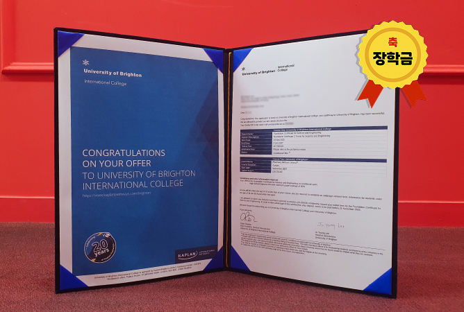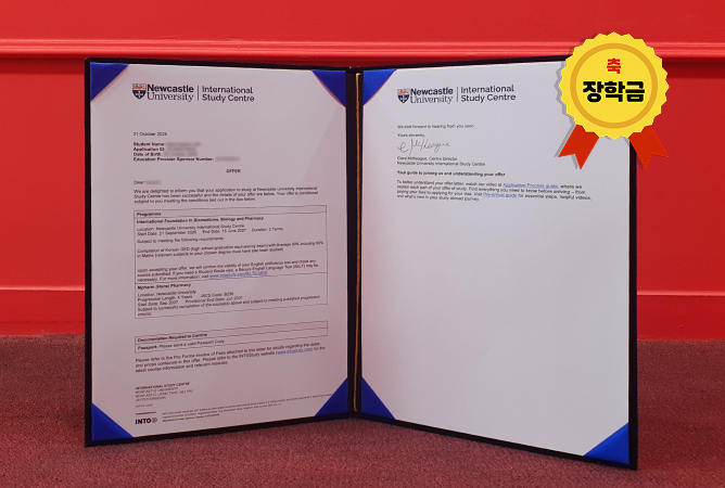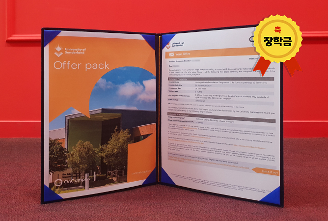 University of Sunderland [26년 10월 시작] 박** - 26년 10월 선더랜드대학교 약대 파운데이션 합격 26년 10월 선더랜드대학교 약대 파운데이션 합격장학금 확정 University of Brighton [26년 9월 시작] 조** - 26년 9월 브라이튼대학교 약대 파운데이션 합격 브라이튼대학교 약대 파운데이션 합격장학금 £1,500 획득 Liverpool John Moores University [26년 10월 시작] 주** - 26년 10월 리버풀존무어스 대학교 약대 파운데이션 합격 검정고시 성적으로 지원, 26년 10월 리버풀존무어스 대학교 약대 파운데이션 합격장학금 확정 Newcastle University [26년 9월 시작] 신** - 뉴캐슬대학교 약대 파운데이션 합격 26년 9월 뉴캐슬대학교 약대 파운데이션 합격장학금 확정 University of Sunderland [26년 1월 시작] 황** - 선더랜드대학교 약대 파운데이션 합격 검정고시 성적으로 지원, 선더랜드 약대 파운데이션 합격장학금 적용 학비 13,000파운드 획득 The University of Manchester [26년 9월 시작] 박** - 맨체스터대학교 약대 파운데이션 합격 현재 국내 고등학교 이과 3학년 재학 중으로, 맨체스터대학교 약대 파운데이션 합격파운데이션 장학금 최대 5,000파운드 예상