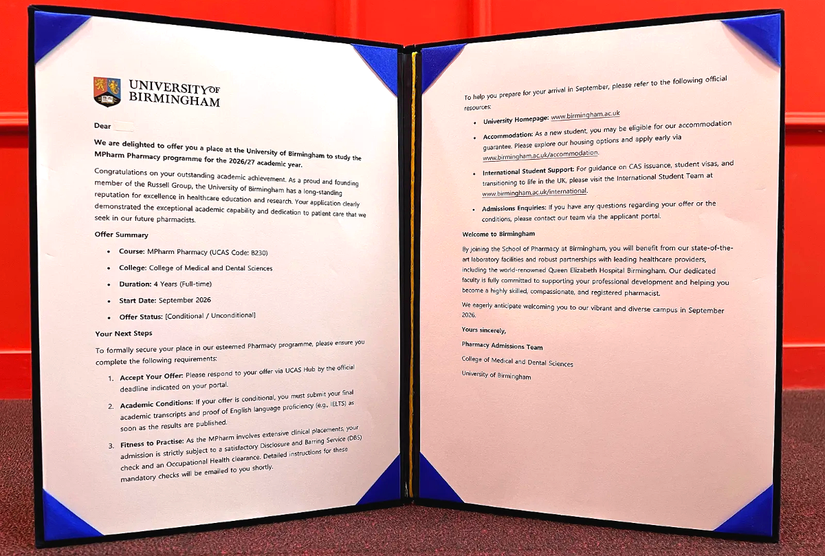 | 코멘트 | Life and Environmental Sciences Foundation 버밍엄대학교 캠퍼스 내 BIA 파운데이션 센터에서 학업 파운데이션 1년 + MPharm 4년 = 총 5년 비자 발급 가능 대학 기숙사 신청 가능 입학 조건 고등학교 졸업: 내신 6등급 / 70점, 수학 & 화학 70점 이상 IB 26점 또는 24점(HL 4·4·4 – 수학, 화학 포함) A레벨 CC(수학, 화학) GCSE 성적만으로는 입학 불가 미국 고등학교: GPA 3.0/4.0(수학, 화학 포함) 수능 불인정 대학 4학기 이상 수료자는 입학 불가 영어 조건 IELTS Academic 6.0(모든 영역 6.0) Duolingo 100 TOEFL iBT 80 PTE 64 파운데이션 수강 과목 전공 기초 과목: Human Biology, Inorganic Chemistry, Organic Chemistry, Materials 필수 과목: Academic English, Advanced Academic English(IELTS 6.5 이상 보유 시 배정) MPharm 1학년 진학 조건 전공 기초 과목 모두 65% 영어 과목 65%(각 영역 55%) 약대 인터뷰 통과(가치관 기반 인터뷰) |